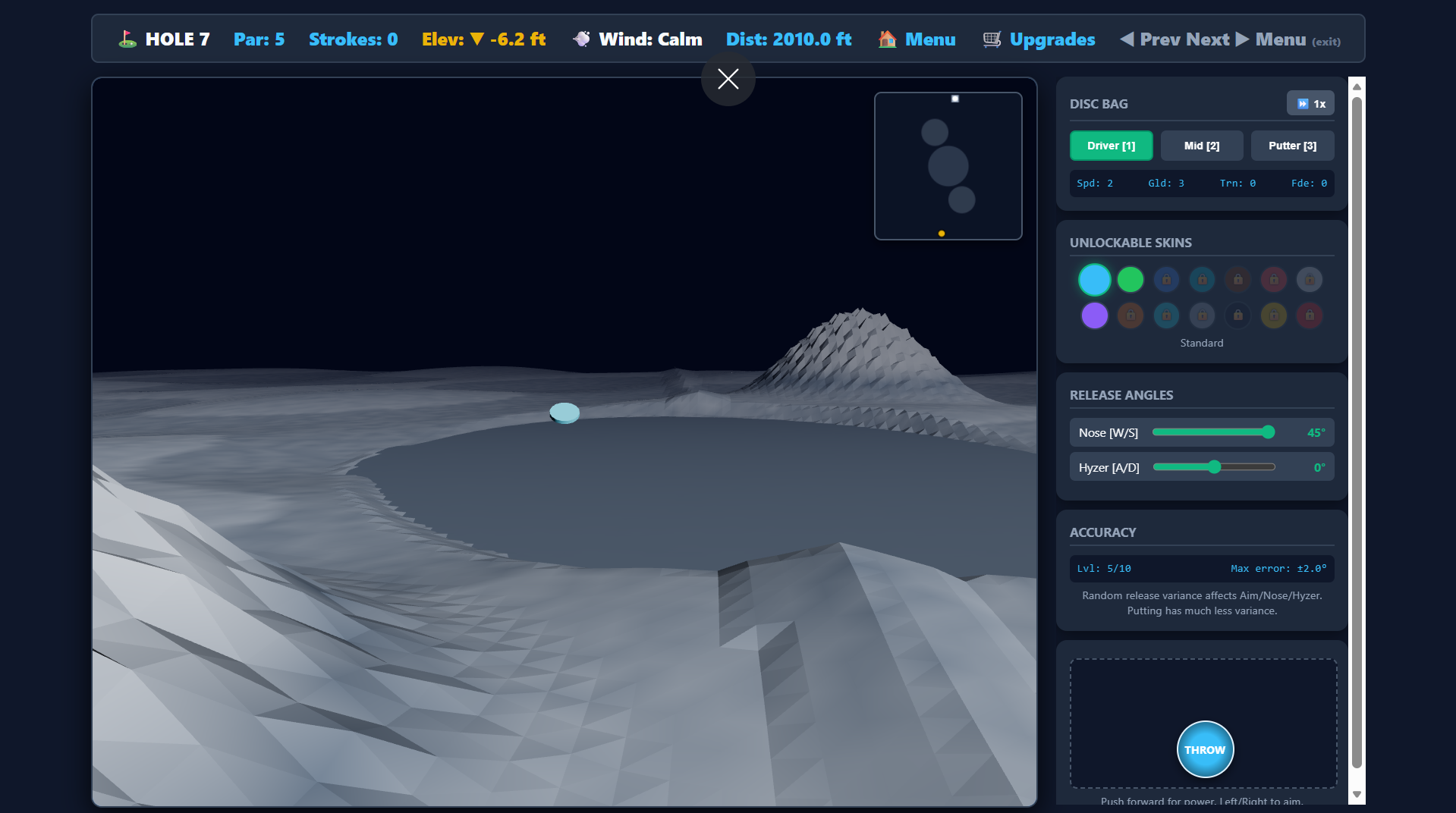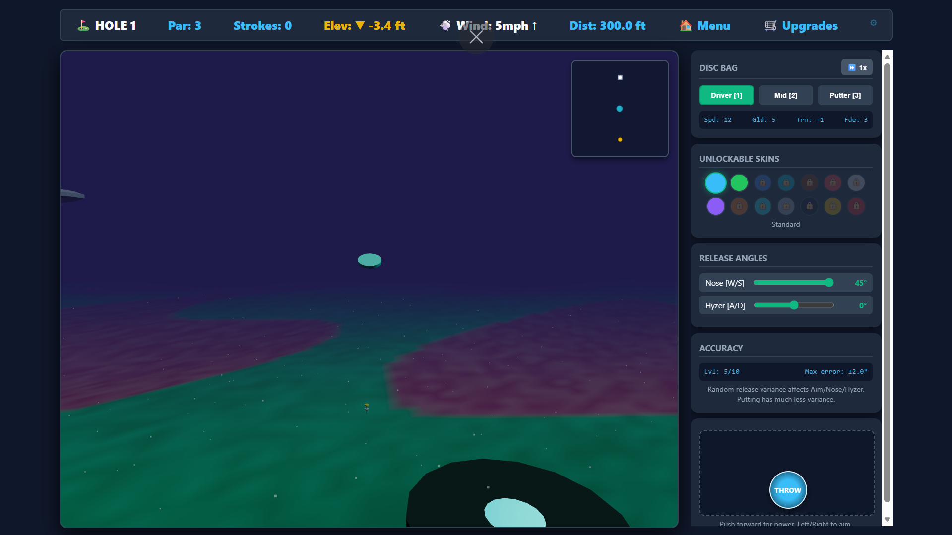 - Disc Selection: Click the buttons on screen or use keys 1 (Driver), 2 (Mid), 3 (Putter).